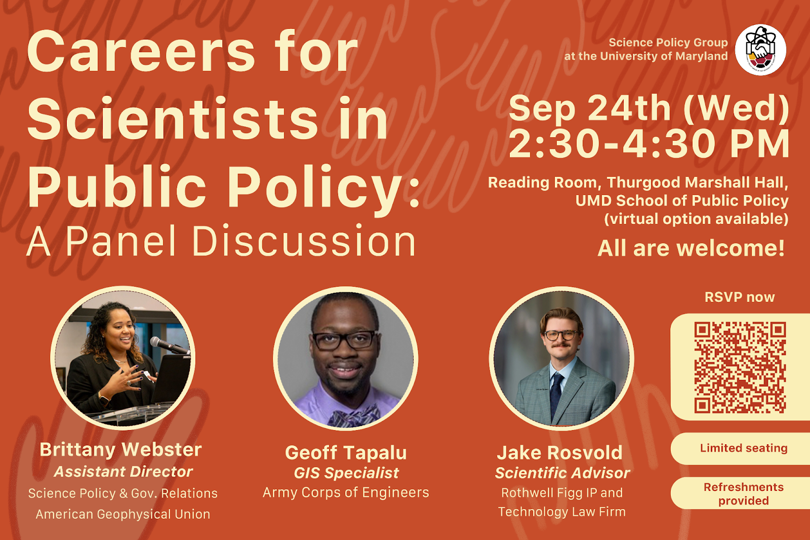 The Science Policy Group at UMD is excited to kick off our 2025–2026 Career Panel Series with an Intro to Science Policy Careers panel! Join us on September 24th from 2:30–4:30 PM in 3301 Thurgood Marshall to hear from experts working across government agencies, non-profits, and law firms. This event will provide an overview of the diverse career paths in science policy, followed by a brief networking reception to connect with our panelists and fellow attendees. Don’t miss this opportunity to explore how your STEM background can translate into impactful policy work!